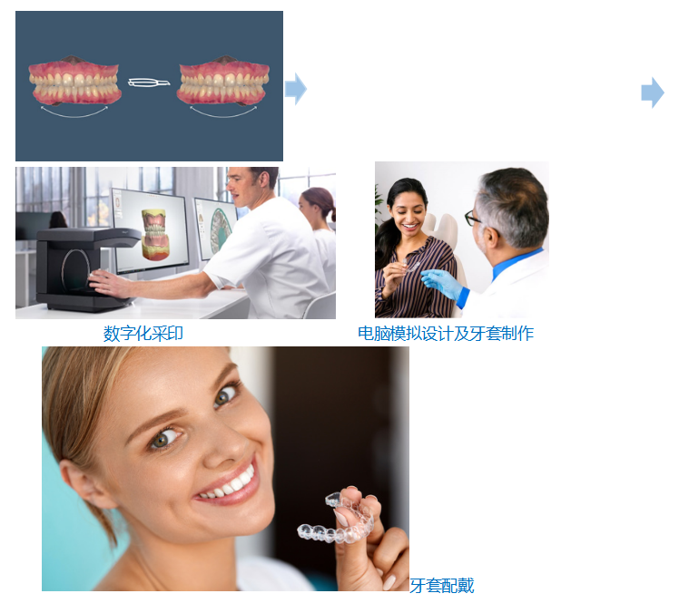 根据CBCT提供的牙齿及颌骨的数字化信息及数字化采印提供的牙弓及牙齿数字化信息,云端技术员利用电脑软件进行建模,并根据医生制定的矫正方案模拟牙齿移动,再由医生进行方案修改与确认,通过3D打印生成并压制成引导牙齿移动的牙套。再由临床医生给患者进行佩戴、监管及调整。最终实现牙齿的移动,完成牙齿矫正。