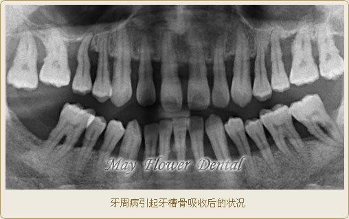牙齿靠牙周组织包括牙龈、牙周膜和牙槽骨将其牢固地固定在颌骨内(即所谓的牙床)。如果将牙齿比喻为大树,牙周组织就是包埋树根(牙根)的“土壤”。牙周病是由细菌(又名牙菌斑,即牙齿上没有被清理干净的“垃圾”)引起的牙齿周围组织的感染。这种感染会引起炎症,从而造成包埋牙齿的牙槽骨的渐进性吸收,即通常大家所说的牙床萎缩,最终导致牙齿的松动。牙周病是引起牙齿松动脱落最重要的原因,由于其患病率非常高,中年以后几乎人人患有牙周病,而且常常累及全口多数牙齿。加上此病通常无疼痛等明显自觉症状,因此很难在早期被发现而得到及时治疗。不治疗的牙周病常常引起口内许多牙齿甚至全口牙的脱落