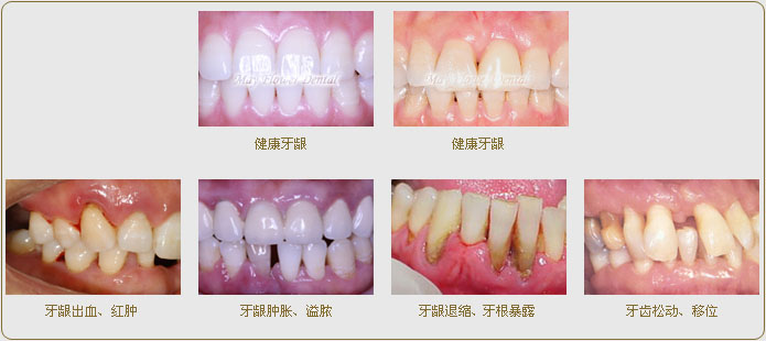 牙周病最常见的症状是牙龈出血,晚期出现牙齿松动。有“牙齿健康的沉默杀手”之称。 牙周病最早期的表现是牙龈炎,表现为牙龈红肿,刷牙出血。及时治疗,此阶段可痊愈。如果不及时治疗,炎症会进一步发展,引起深部的牙槽骨吸收,发展成牙周炎。轻度的牙周炎可见牙龈红肿,刷牙出血。中度牙周炎可出现咀嚼无力,口臭,牙龈退缩,牙根暴露,牙床肿痛即所谓的“上火“。重度牙周炎可出现牙齿松动,移位,疼痛,溢脓等症状,最终牙齿脱落。